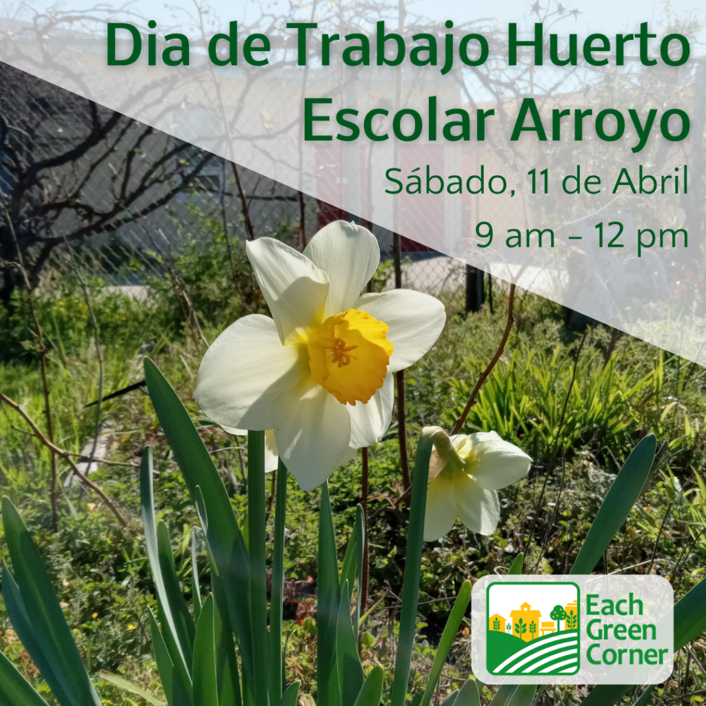 ¡Participa este fin de semana, el 11 de abril, para un día de trabajo en el jardín de la Escuela Primaria Arroyo! Sigue este enlace al formulario de registro para voluntarios: https://eachgreencorner.app.neoncrm.com/event.jsp?event=30826&