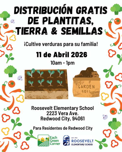 Este mes, en el 11 de abril, la Escuela Primaria Roosevelt llevará a cabo una distribución gratuita de plántulas y tierra. No se pierda esta oportunidad de iniciar su propio huerto y unirse a la misión de Each Green Corner de promover la seguridad alimentaria en todo el condado de San Mateo.