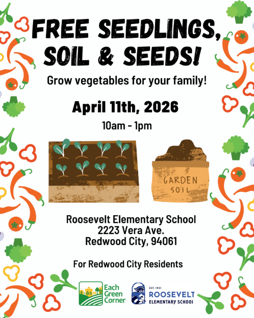 This month on April 11th, Roosevelt Elementary will be holding a seedling and soil giveaway. Don’t miss this opportunity to begin your own food garden and join Each Green Corner’s mission of promoting food security across the San Mateo County!